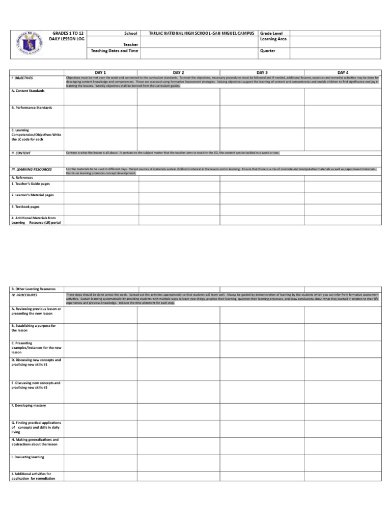 Templates can be printed as is or customized for a teacher's. Recognizing this, the department of education has introduced the daily lesson. download new daily lesson log (dll) template in ms word (.docx) format. download k to 12 dll | junior and senior high school. effective lesson planning stands as a cornerstone to successful teaching and learning. Daily lesson log (dll) is a template that teachers use to log parts of their daily lessons.